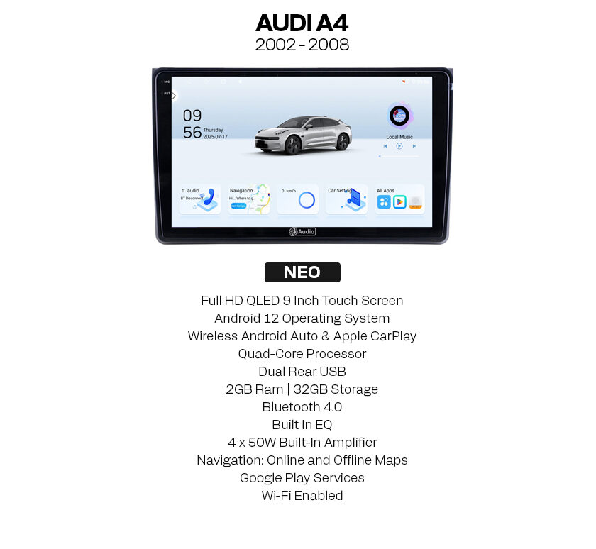 The TT Audio Audi A4 2002 – 2008 Neo Multimedia Player powered by Android Operating System delivers a seamless and intuitive interface. Enjoy snappy performance thanks to its quad-core processor, while 2GB of RAM ensures smooth multitasking. With 32GB of storage, you’ll have ample space for your favourite apps, music, and more.