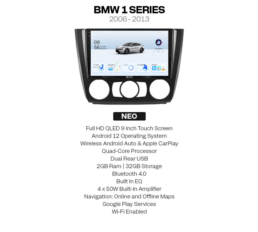 The TT Audio BMW 1 Series Manual Neo Multimedia Player offers a range of advanced features, including a 9-inch touchscreen, Android operating system, and wireless connectivity, providing a seamless and enjoyable driving experience.