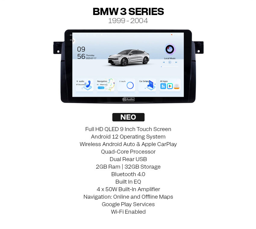 The TT Audio BMWÂ 3 Series E46 Neo Multimedia Player, powered by Android, delivers a seamless, intuitive interface. Enjoy snappy performance thanks to its quad-core processor, while 2GB of RAM ensures smooth multitasking. With 32GB of storage, you’ll have ample space for your favourite apps, music, and more.