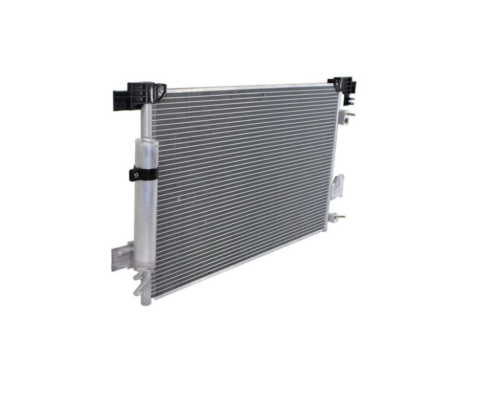 The condenser is a heat exchanger and located at the front of the vehicle. The condenser cools down the refrigerant heated up by the compressor. It becomes a liquid (condensates) by transferring its heat to the external air passing through it.